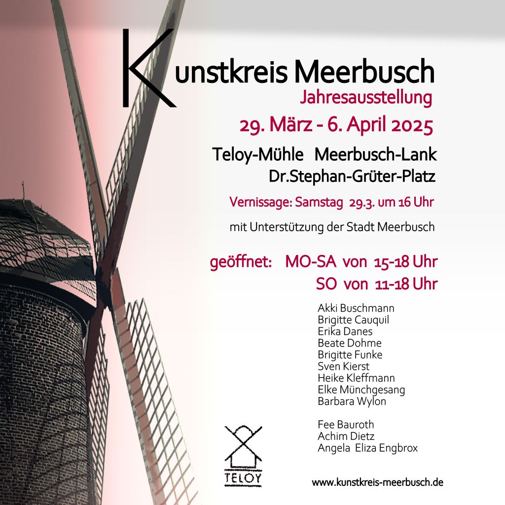 Dank der guten Zusammenarbeit mit dem Kulturamt der Stadt Meerbusch werden unsere Ausstellungen in der TELOY MÜHLE gefördert. Diese Förderung ermöglicht unser Weiterbestehen und die Öffnung gegenüber Gastkünstler*innen aus der Region sowie neuen Mitgliedern, die sich unserer Gruppe anschließen möchten.